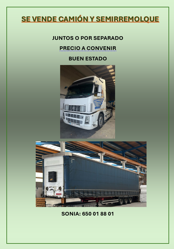 Se venden tractora VOLVO FH 42 B3 440 del año 2008 y semirremolque Lecitrailer 3 E20 del año 2012 por fin de actividad.